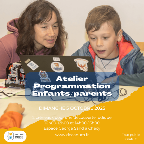 Description Dans le cadre de la Fête de la Science organisée par la ville de Chécy, l’association Decanum (Découvrir et Apprivoiser le Numérique) propose un atelier participatif et intergénérationnel de robotique éducative, à destination des enfants de 8 à 14 ans accompagnés d’un parent.