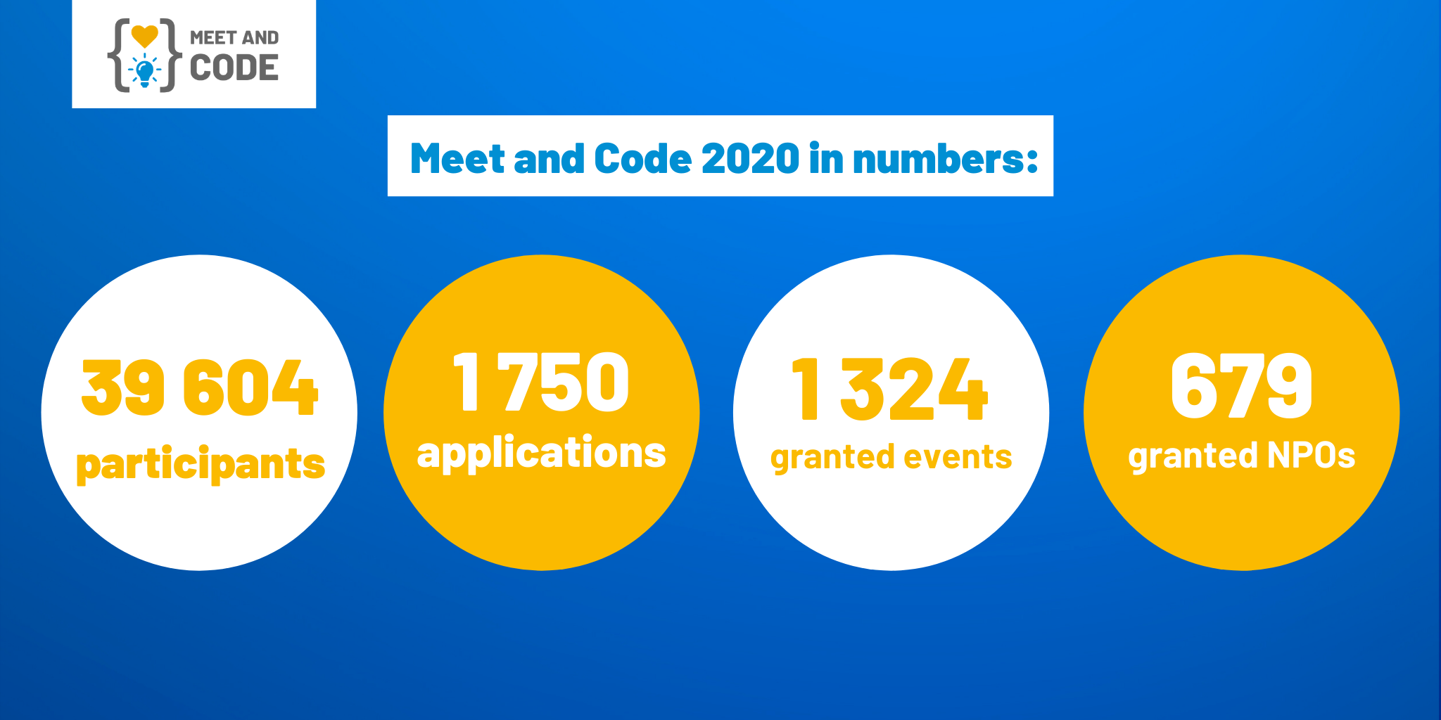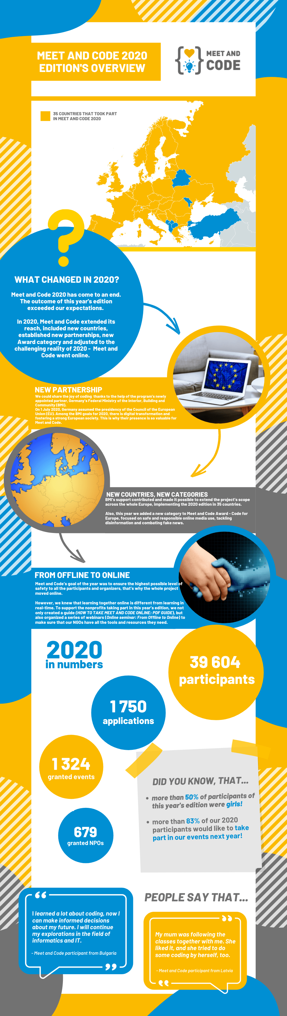 In 2020, Meet and Code extended its reach, included new countries, established new partnerships, new Award category and adjusted to the challenging reality of 2020 - Meet and Code went online.